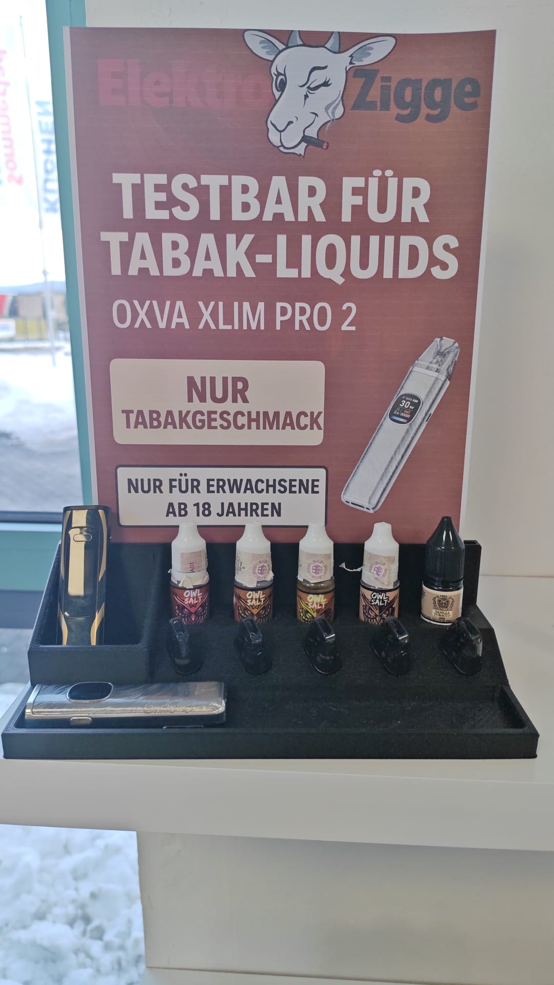 Dieses 3D-Druck-Modell ist ein funktionaler Testbar-Halter für den Einsatz im Verkaufsraum oder auf dem Tresen. Entwickelt für eine saubere, übersichtliche Präsentation von Tabak-Liquids und Pod-Systemen (z. B. Oxva-Größe).